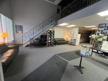 * Large Lobby Area from front door, 4 Café tables & chairs, 2 couch couches, 2 Coat closets